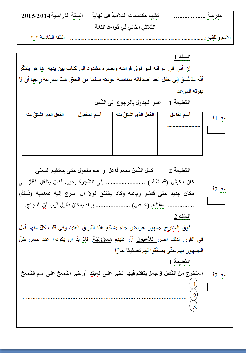 تقييمات في قواعد اللغة السنة الثالثة ابتدائي Devoir Tn