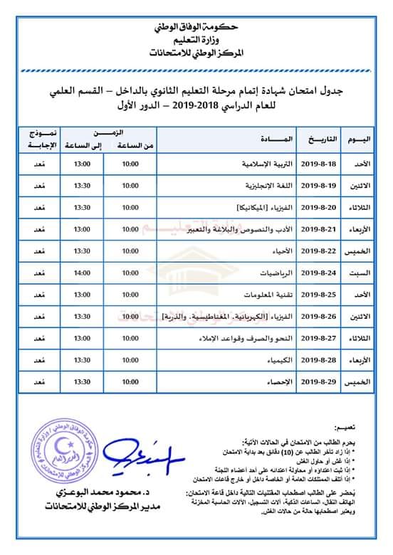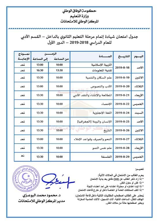 جدول امتحانات شهادة إتمام مرحلة التعليم الثانوي بالداخل و الخارج في ليبيا القسم العلمي و الادبي للعام الدراسي 2018 2019 الدور الأول